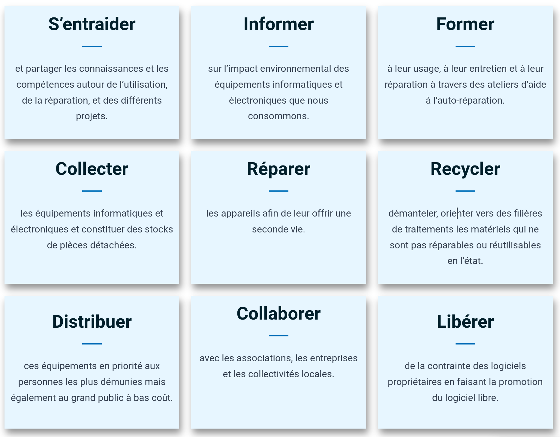 - D’une part de lutter contre l’obsolescence de plus en plus rapide des appareils informatiques et électroniques ainsi que des déchets qui en résultent.